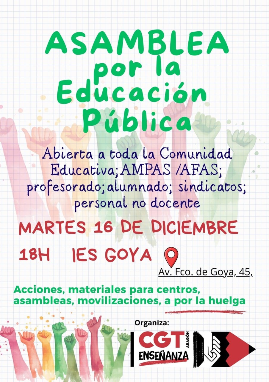 El próximo martes 16 de diciembre de 2025, celebraremos una Asamblea Abierta por la Educación Pública a toda la Comunidad Educativa.