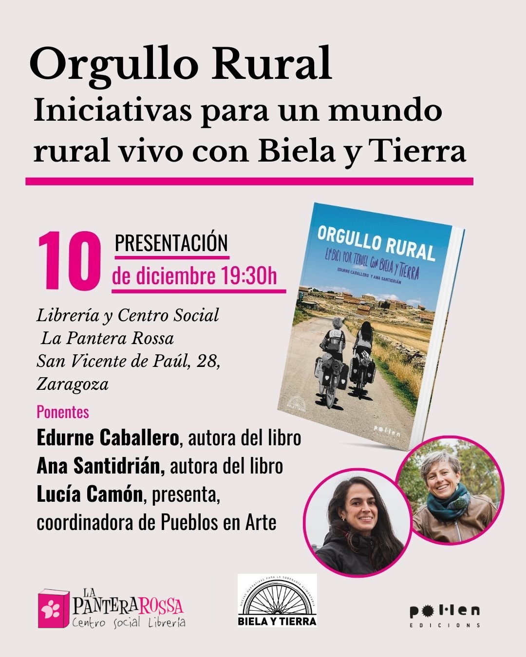 Presentación miércoles 10 de diciembre de 2025 a las 19.30 horas en La Pantera Rossa con las autoras Edurne Caballero y Ana Santidrián (de Biela y Tierra). Presenta Lucía Camón, coordinadora de Pueblos en Arte. Orgullo Rural En bici por Teruel con Biela y Tierra está editado por Pol·len Edicions y Biela y Tierra.