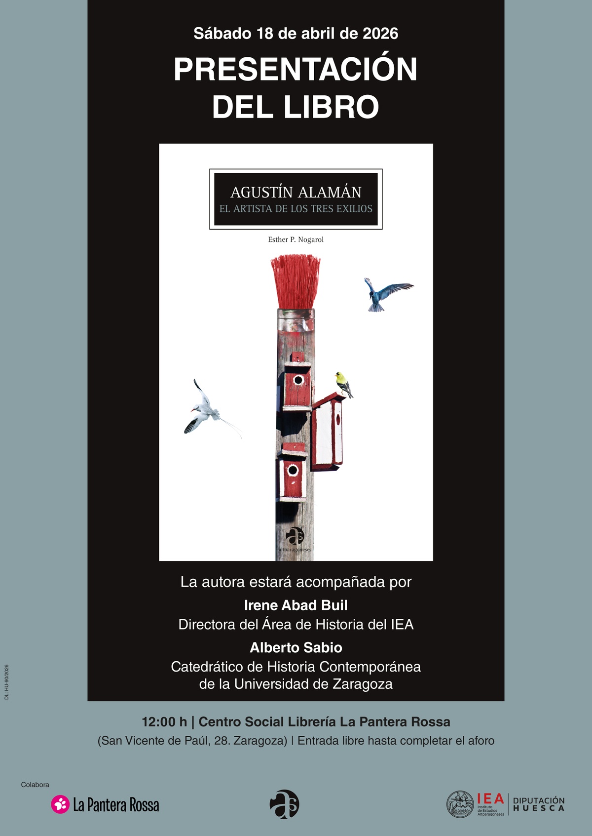 El libro, cuya edición ha concluido cuando se cumplían treinta años del fallecimiento de Agustín Alamán, el 17 de marzo de 2026, verá la luz en los próximos días y, tras su presentación en Huesca del 10 de abril, será presentado en Zaragoza el sábado 18 de abril en el Centro Social Librería La Pantera Rossa (San Vicente de Paúl, 28), a partir de las 12:00 horas. A esta seguirán otras que se están preparando en Madrid y en Toulouse.