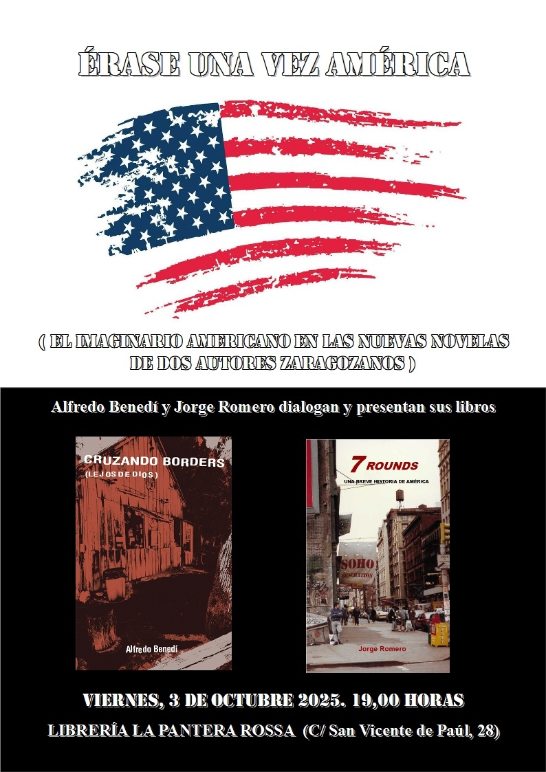 El viernes 3 de octubre, a las 19.00 horas en La Pantera Rossa, tendrá lugar la presentación conjunta "ÉRASE UNA VEZ AMÉRICA, El imaginario americano en dos nuevas novelas de autores zaragozanos", con los escritores aragoneses Jorge Romero y Alfredo Benedí.