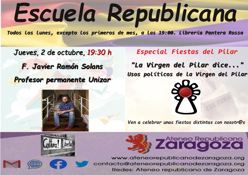 El jueves 2 octubre, 2025 a las 19:30 La escuela Republicana organiza en La Pantera Rossa (San Vicente de Paúl 28. Zaragoza) una charla "especial Fiestas del Pilar" con el libro «La Virgen del Pilar dice...» Usos políticos y nacionales de un culto mariano en la España contemporánea. Contaremos con la presencia de su autor F. Javier Ramón Solans (Prensas de la Universidad de Zaragoza).