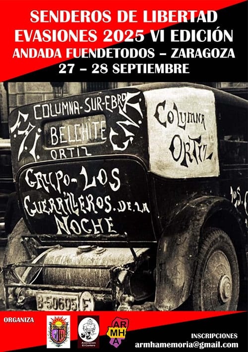 Hijos de la Noche, los guerrilleros anarquistas que jugandose la vida sacaron de Zarsgoza a varios cientos de personas en peligro de sufrir la represión franquista. Las llevaban a Fuendetodos, zona republicana, a través de los montes de Torrero