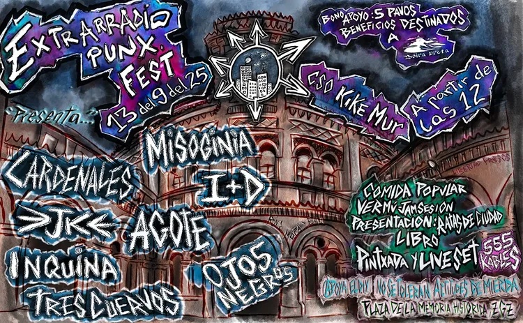 A modo de sello, discografica o como se le quiera llamar.. Extrarradio Punks agrupa diferentes bandas y artistas (Munizia Polizipal, Tres Cuervos, Chalupas, Déficit de entusiasmo, Ejke, Debuti o Steven Spizberg son algunos ejemplos) que son basicamente una familia de buenxs amigxs.
