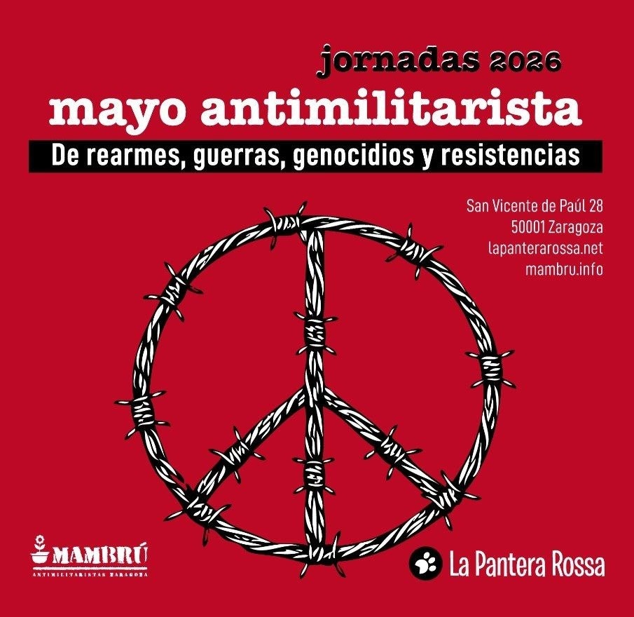 Frente a esta inercia destructiva, las Jornadas Mayo Antimilitarista 2026, organizadas por Antimilitaristas Zaragoza "Mambrú" con la colaboración de La Pantera Rossa, nacen como un espacio de encuentro, análisis y, sobre todo, resistencia. No queremos ser espectadores pasivos de la barbarie. Queremos entender los mecanismos que legitiman el exterminio, señalar a quienes se lucran con la guerra desde nuestras propias ciudades y buscar grietas de esperanza en la justicia internacional y la acción noviolenta.