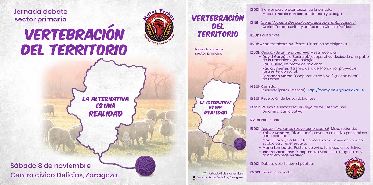 Malas Yerbas propone un espacio de debate abierto para profundizar en la búsqueda de soluciones frente a la problemática de la falta de relevo generacional y la tendencia de acaparación de tierras por parte de fondos de inversión y macro proyectos “que producen una pérdida constante de personas agricultoras y ganaderas dejando los pueblos cada vez más vacíos”.