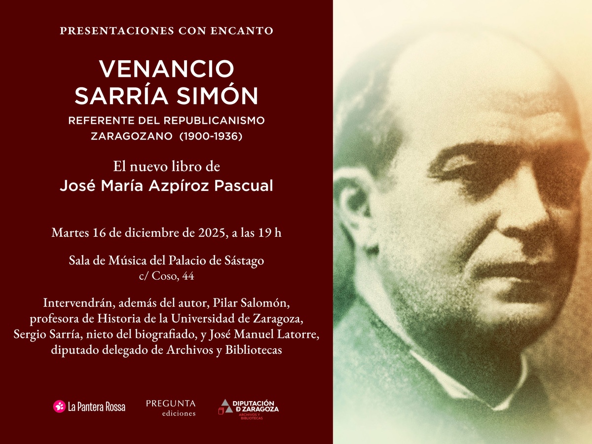 El martes 16 de diciembre, José María Azpíroz Pascual y la editorial Pregunta presentan su libro Venancio Sarría Simón, referente del republicanismo zaragozano en Zaragoza: a las 19 h en la sala de música del palacio de Sástago (c/ Coso, 44), acompañado por Pilar Salomón, profesora de Historia de la Universidad de Zaragoza, Sergio Sarría, nieto del biografiado, y José Manuel Latorre, diputado delegado de Archivos y Bibliotecas. Colabora la librería La Pantera Rossa.